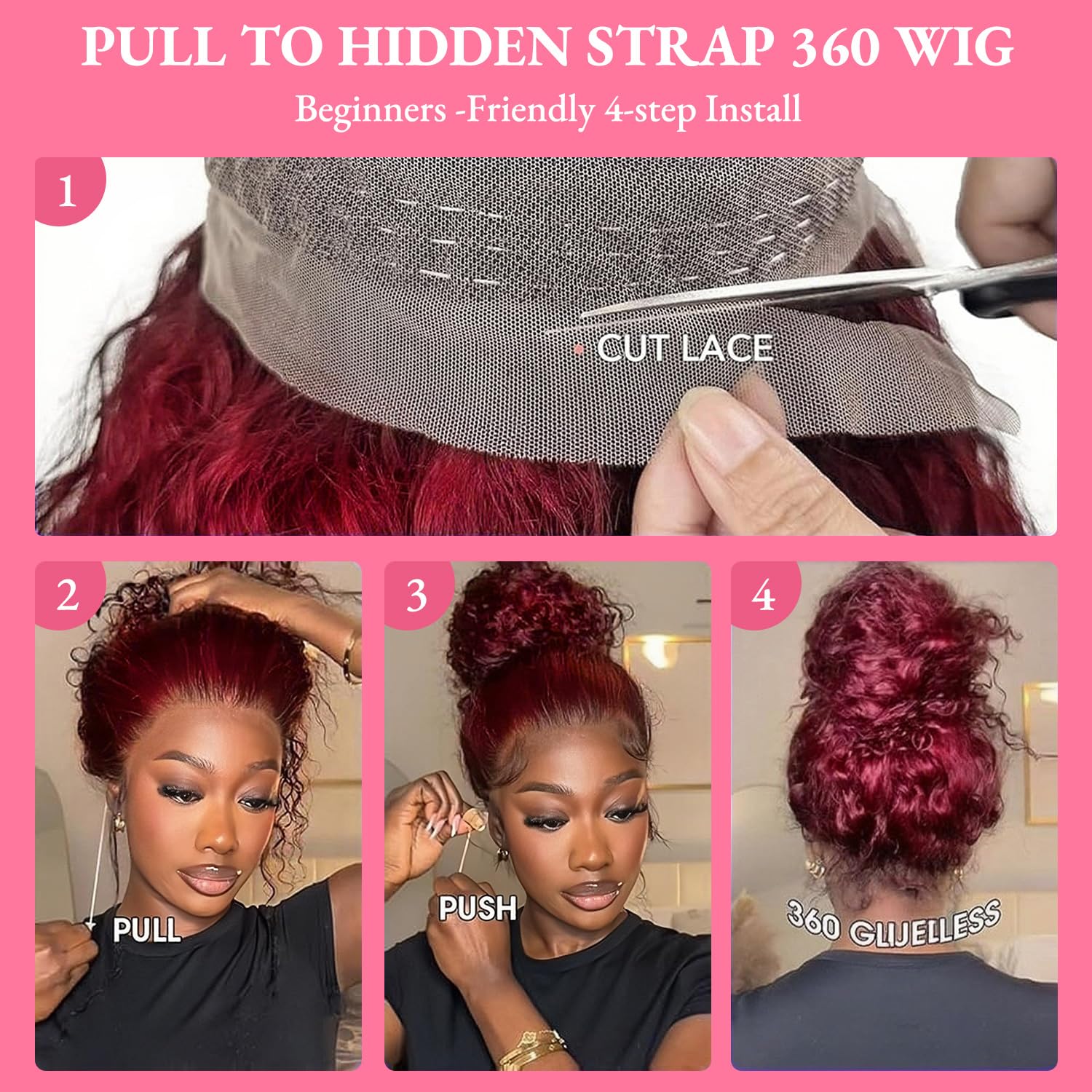 Details: 250 Density Hidden Strap Water Wave 360 99j Burgundy Glueless Wigs Human Hair Pre Plucked Pre Bleached Human Hair Wig With Drawstring Wet and Wavy HD Full Lace Front Wigs Human Hair 22 Inch