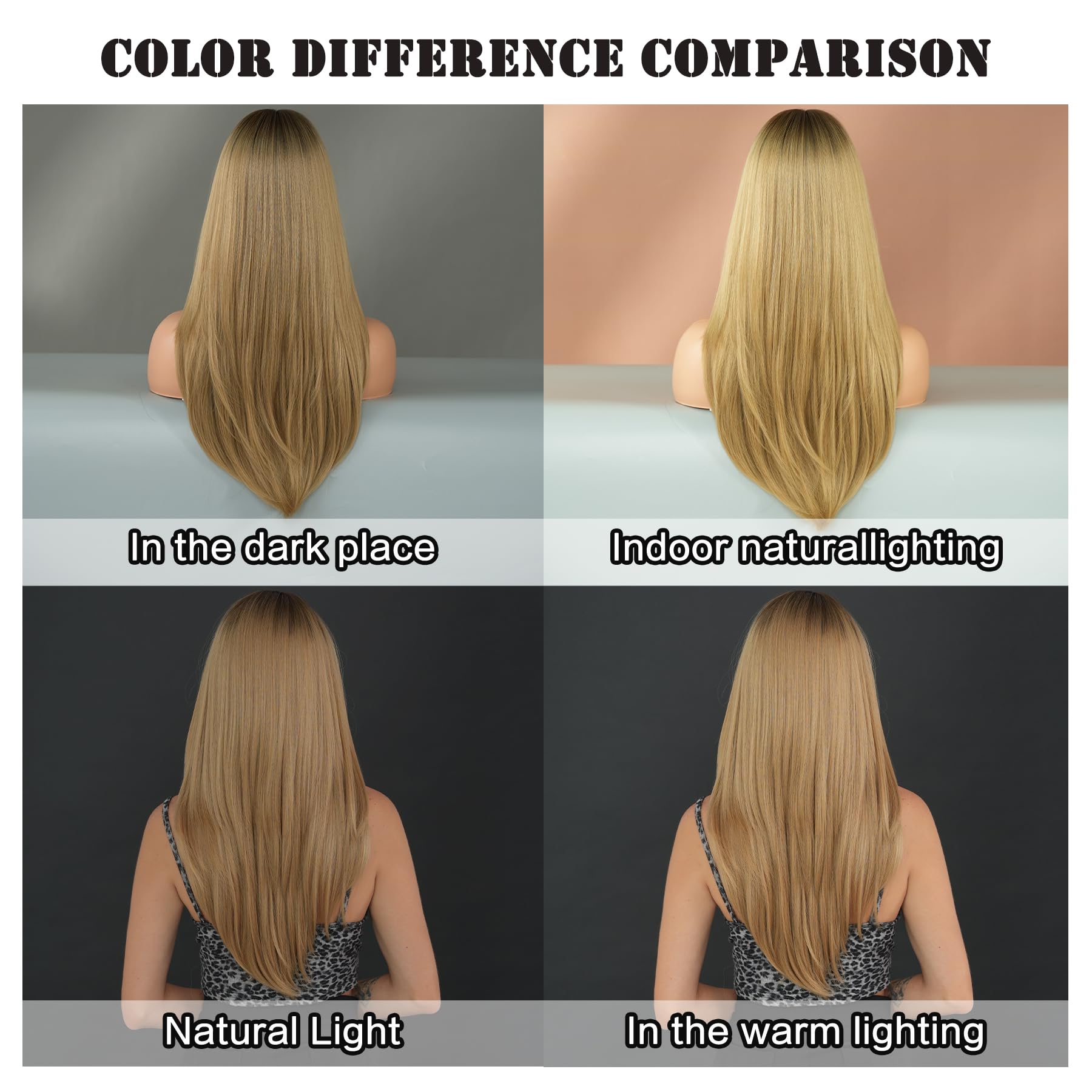 7JHH WIGS Blonde Layered Wig with Curtain Bangs Long Straight Pixie Cut wig with Dark Roots Natural Looking Heat Resistant Synthetic Hair Fiber Wigs for Women Daily Used