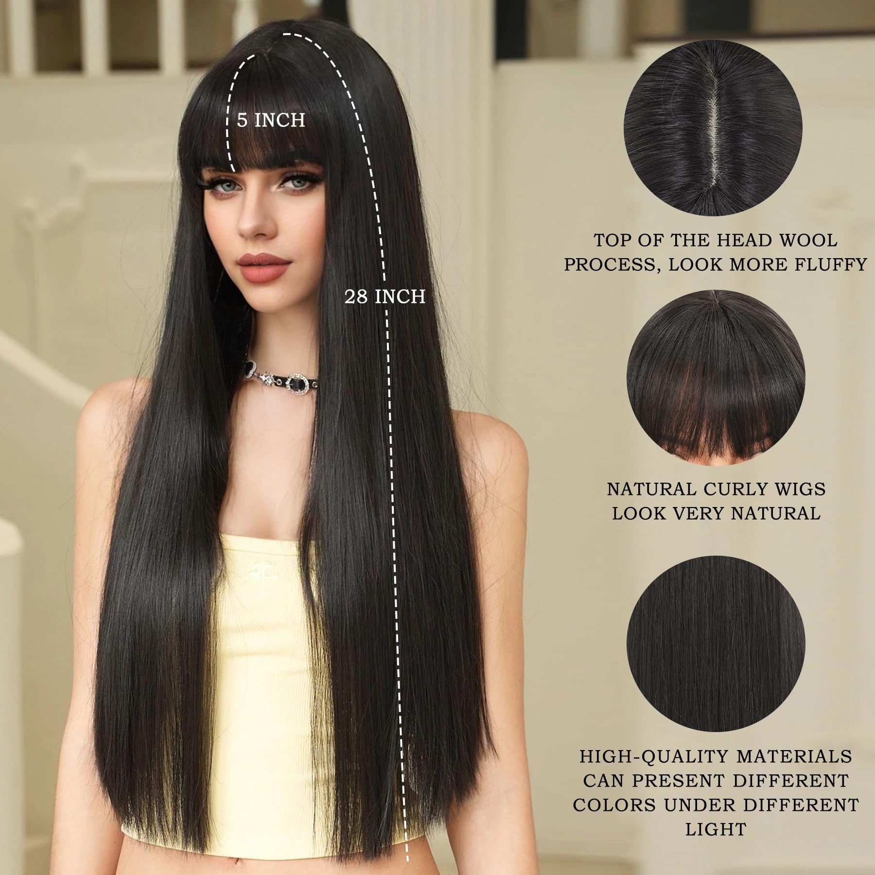 - ★【Ultra-realistic Wigs】The fashion natural black long straight wig adopts the front bangs design, which perfectly covers the hairline, helps you create a truly natural makeup, perfectly fits the skin, and makes the long layered cut synthetic straight wig look more natural and lifelike.The long wig with bangs design makes this wig a popular look.