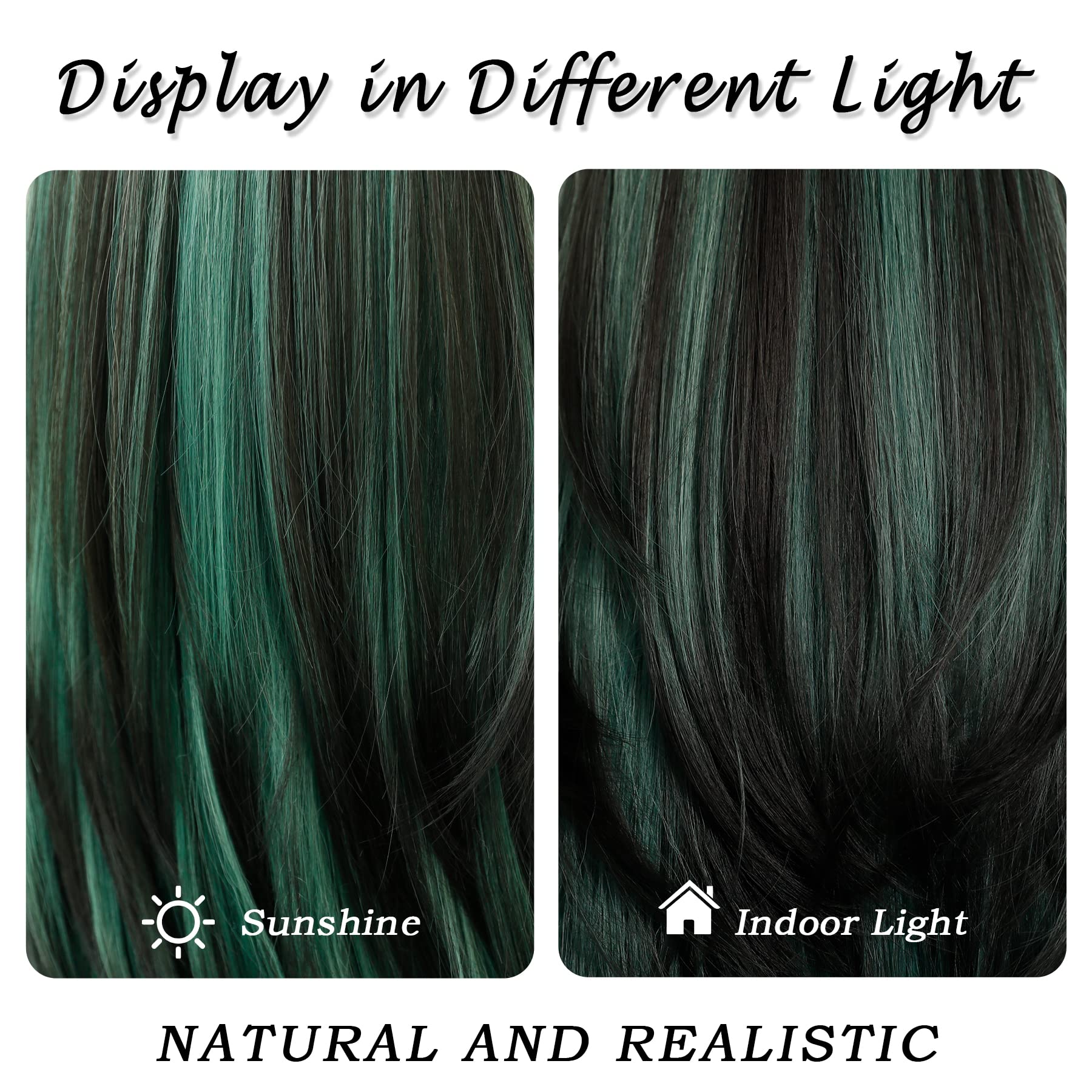 - ★ Green wig with curtain bangs is layered straight , it flows curvature very naturally , easy to take care of, the layers help to give a good shape and overall.