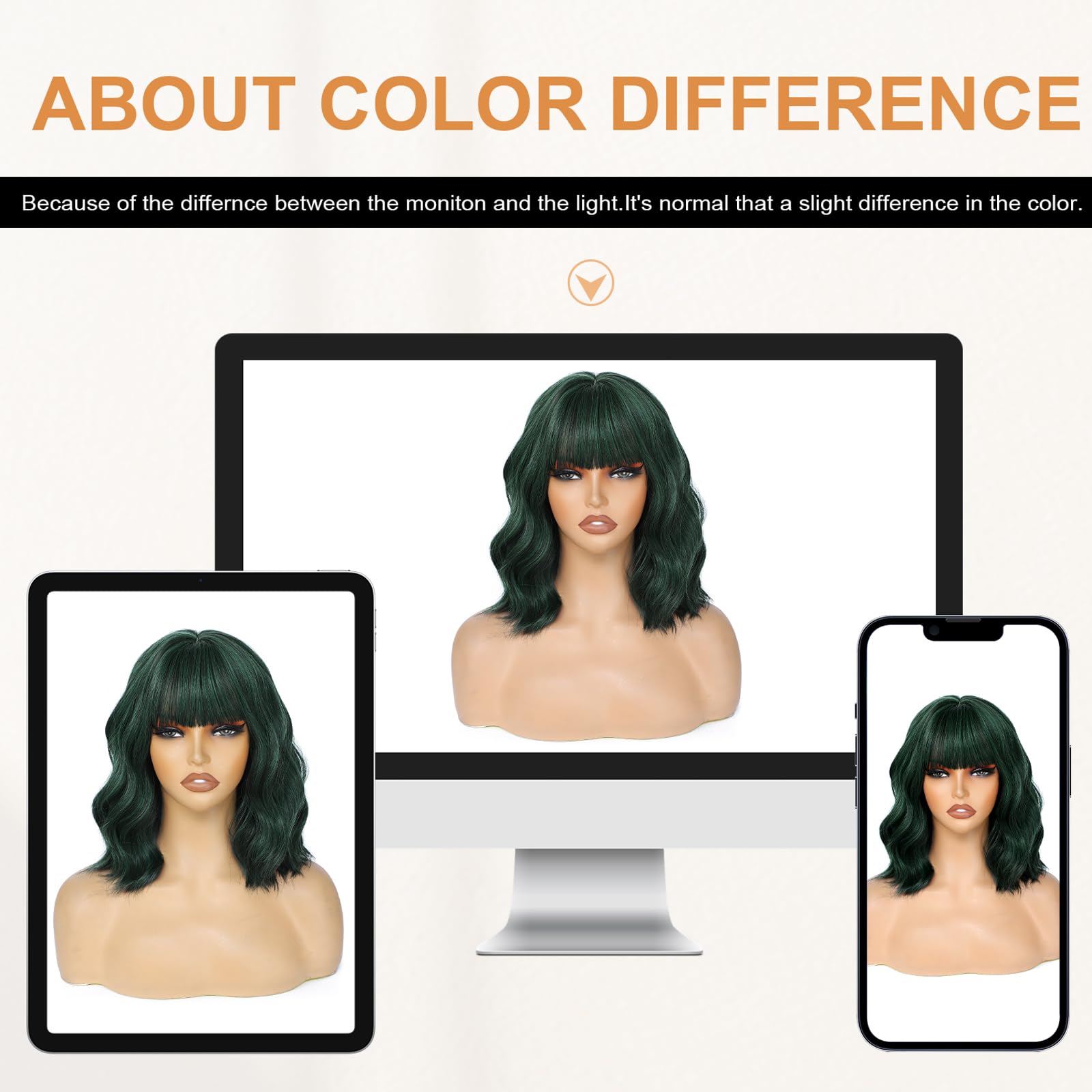 AGO Short Bob Wig with Bangs Dark Green Loose Wave Wigs Shoulder Length 14Inch for Women Colorful Costume Wig Heat Resistant Fiber Hair for Daily Party Halloween Cosplay Use(4/610#DarkGreen)