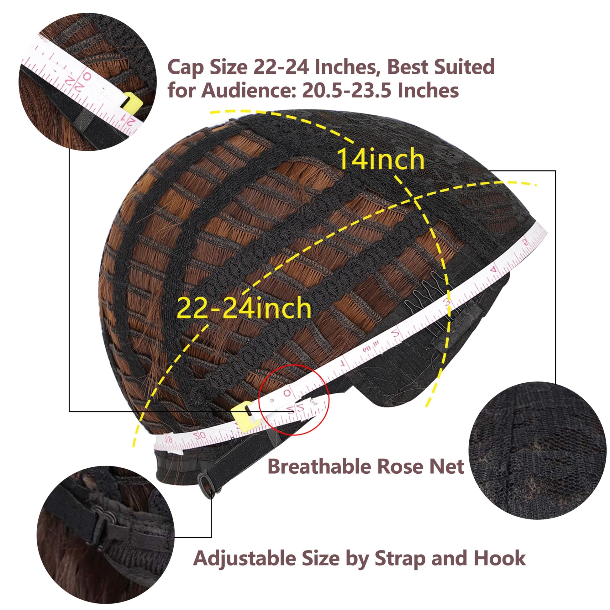 Wig Cap: Cap Circumference 22-24”We recommend the best wearing head circumference of 21.5''-23.5''