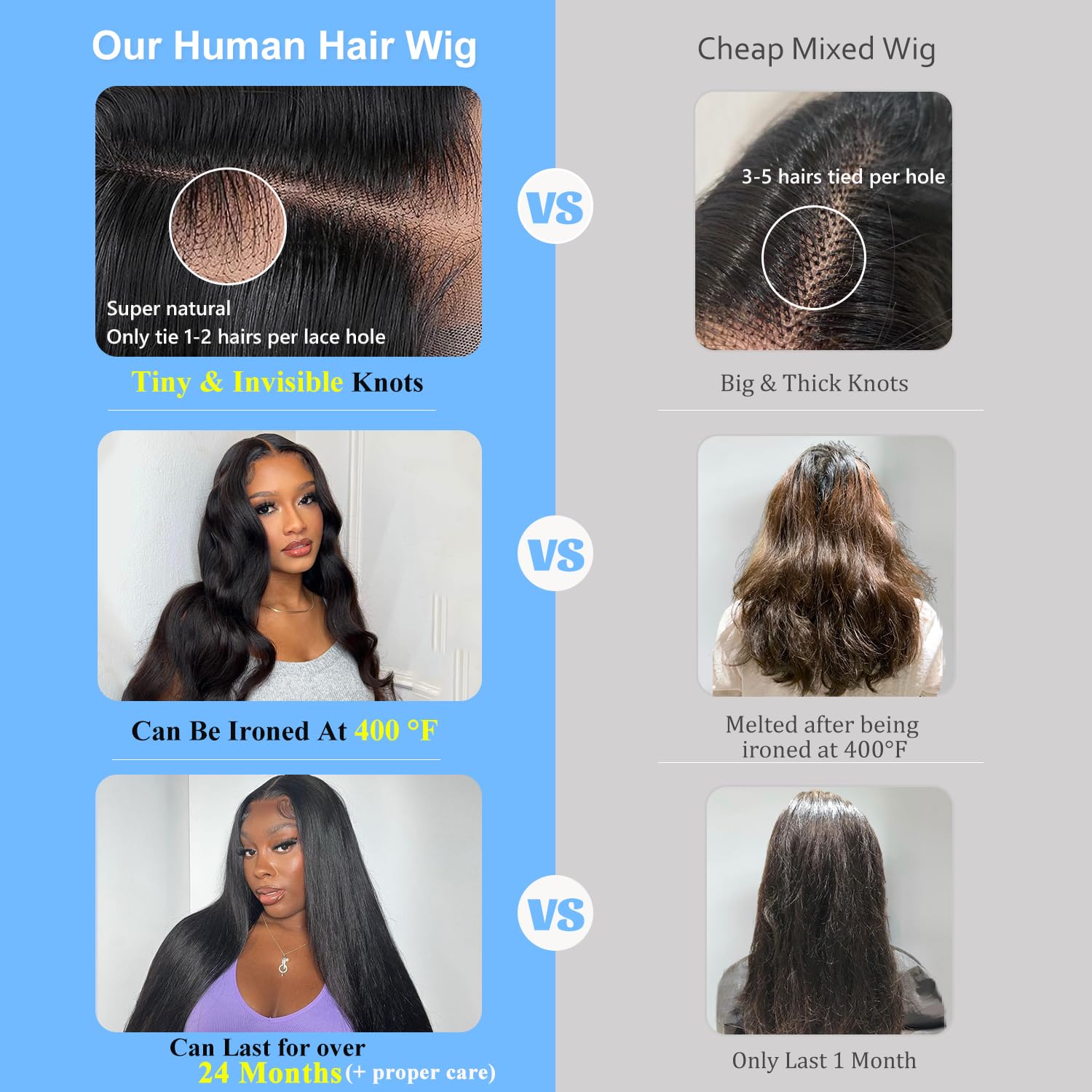 - 100% Real Human Hair :100% Virgin Human Hair,Can Last 24 Months (with proper care) . 2 Year Warranty. Heat-Safe Up to 400°F—Style, Curl, or Straighten Effortlessly. Minimal Shedding & Tangling with A Natural, Healthy Texture
