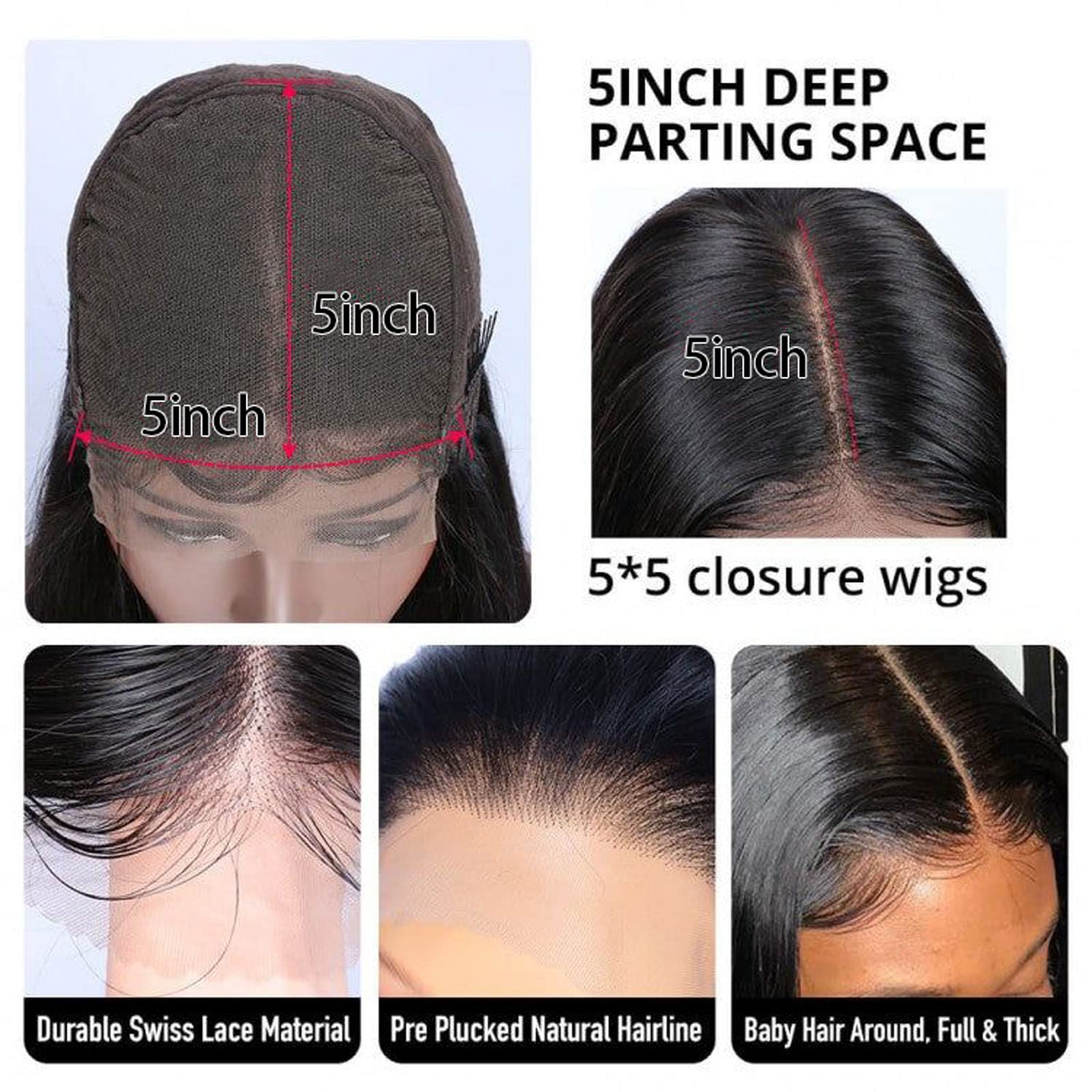 - 1、5x5 Lace Closure Wigs Human Hair Material: 5x5 Closure wig,100% Unprocessed 10A Brazilian virgin human hair deep wave lace closure wigs, full and thick, natural look, health and comfort, soft and bouncy, can be dyed, bleached, straightened and restyled
