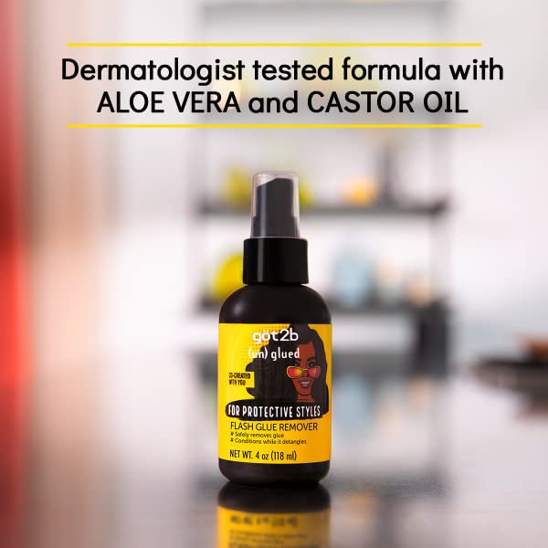 Details: Co-created with and for protective style wearers, got2b (un)Glued Flash Glue Remover gently removes got2b Glued Bonding Glue and conditions when sprayed on natural or synthetic hair. Unglue your wig and detangle your hair with our Flash Glue Remover Spray. Our dermatologist tested formula with Aloe Vera and Castor Oil softens glue to safely remove our got2b Glued Bonding Glue on protective styles in a flash and helps to remove residue. Our glue remover is easy to apply, safe for skin, scalp and edges and specially formulated to be used in conjunction with our got2b Glued Bonding Glue.