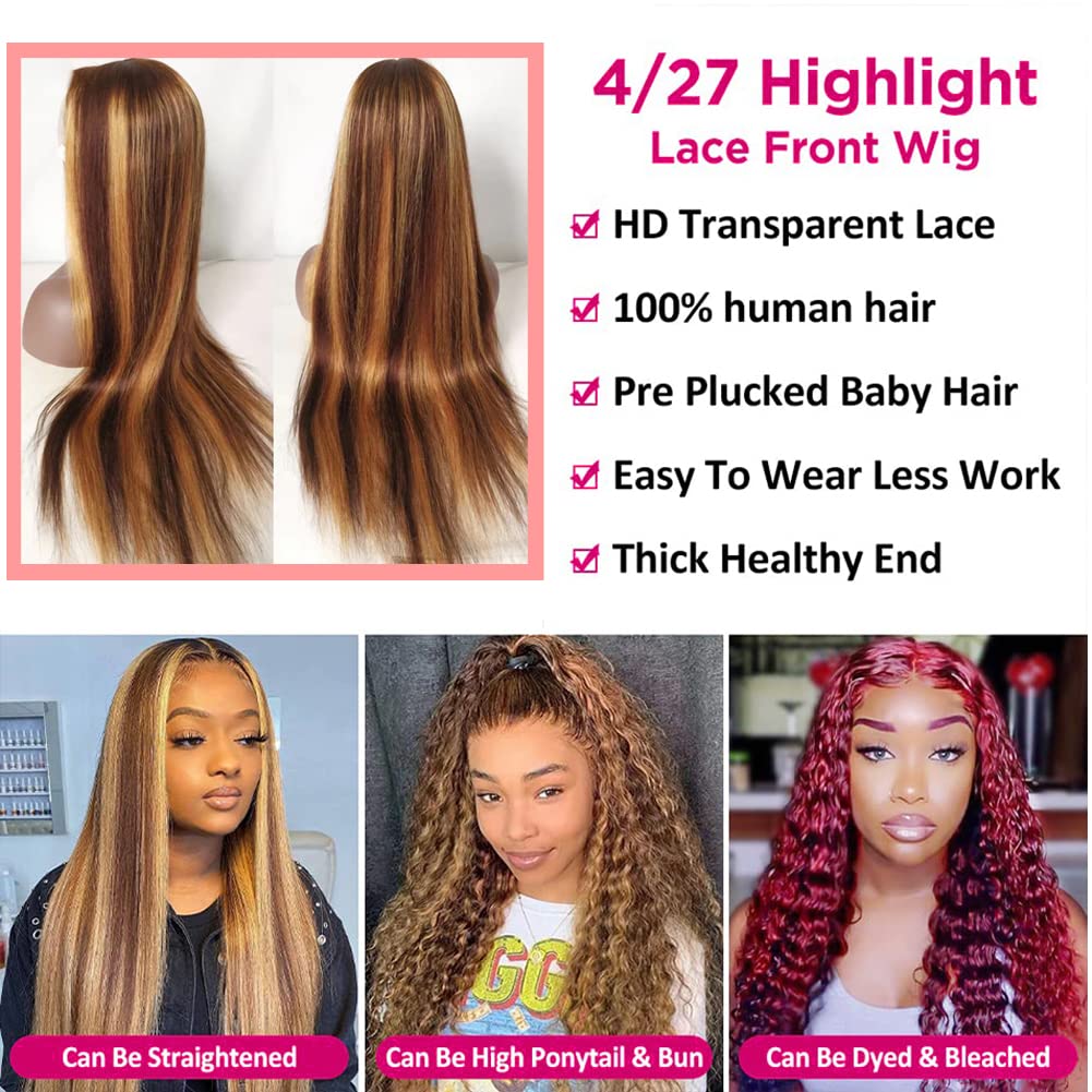 Healthair Ombre Lace Front Wigs Human hair Highlight 4/27 Honey Blonde Lace Front Wig 180% Density Straight Human Hair Wig 13x4 HD Transparent Lace Wigs for Black Women (4/27, 20inch)