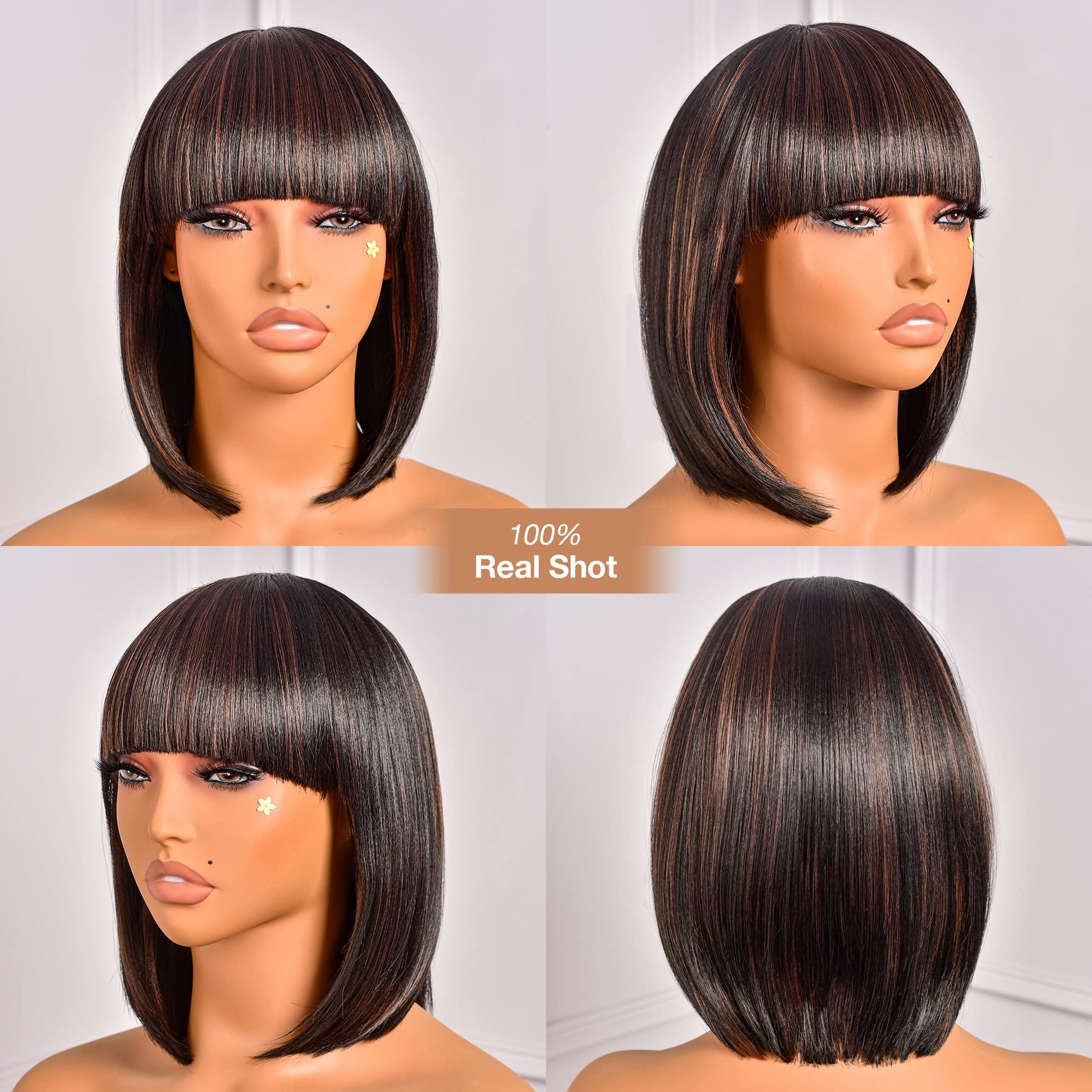 ToyoTress Short Bob Wigs With Bangs - 12 Inch Black Mix Brown Yaki Straight Hair Daily Costume Wig For Black Women, Soft Light Synthetic Hair Replacement Wigs Heat Resistant (12 Inch, SP1B/30-612H)