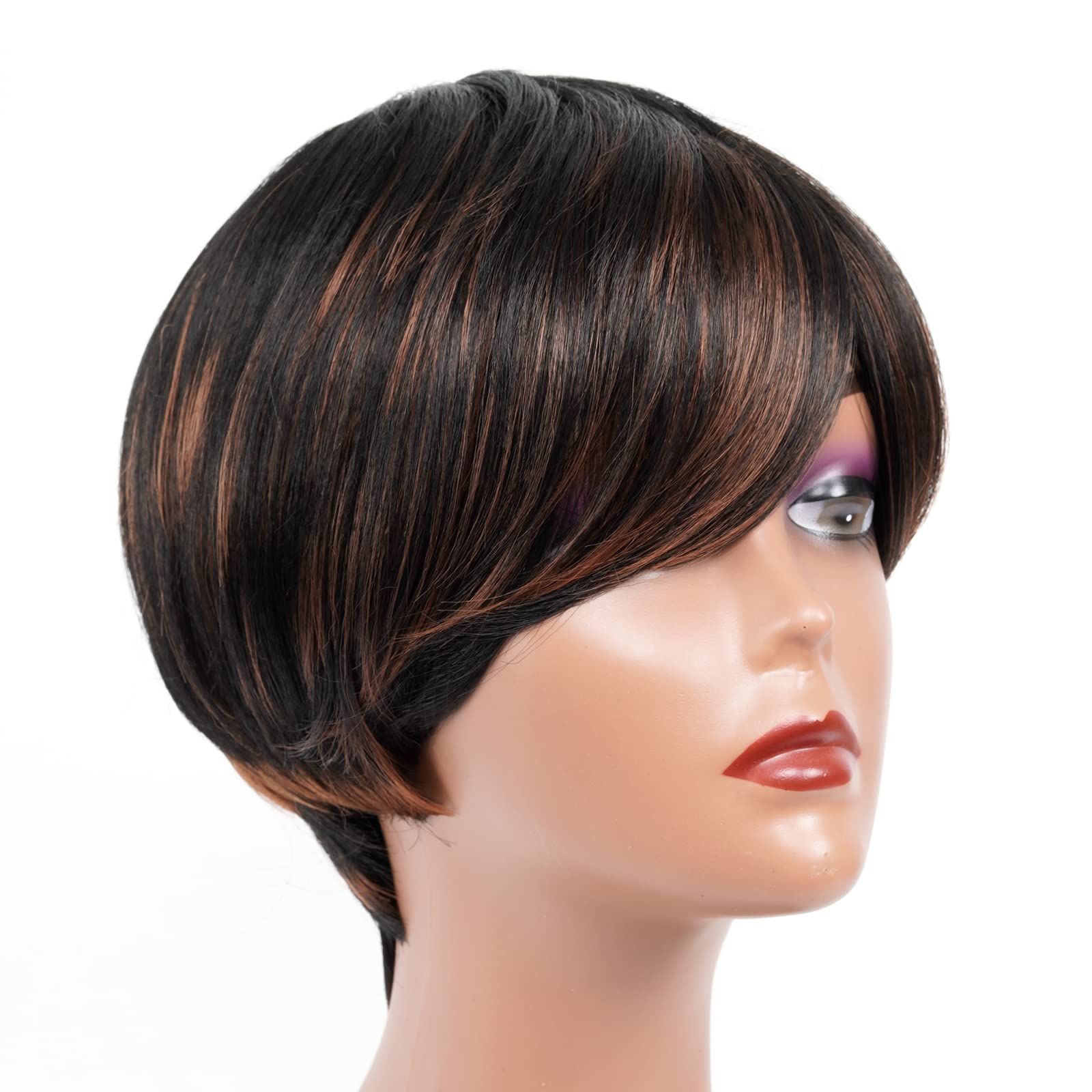 - WIG CARE: Gently shampoo & condition in cool temperature water; Place the short pixie wig with bangs on a mannequin head at night to keep the style and wig cap intact; Store in dry place when not in use.