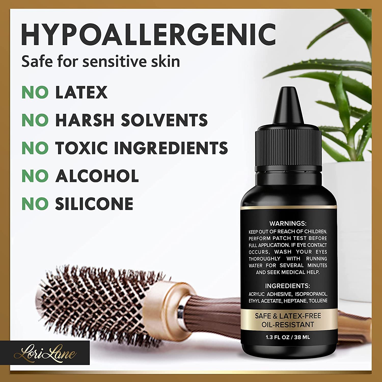 - Safe & Latex-Free - LoriLane is committed to creating beauty must-haves for women and men all over the world, so we use only the finest ingredients. Our lace wig glue contains no latex, no silicone, and no harsh solvents, making it safe for sensitive skin. Doesn't cause irritation or burning!
