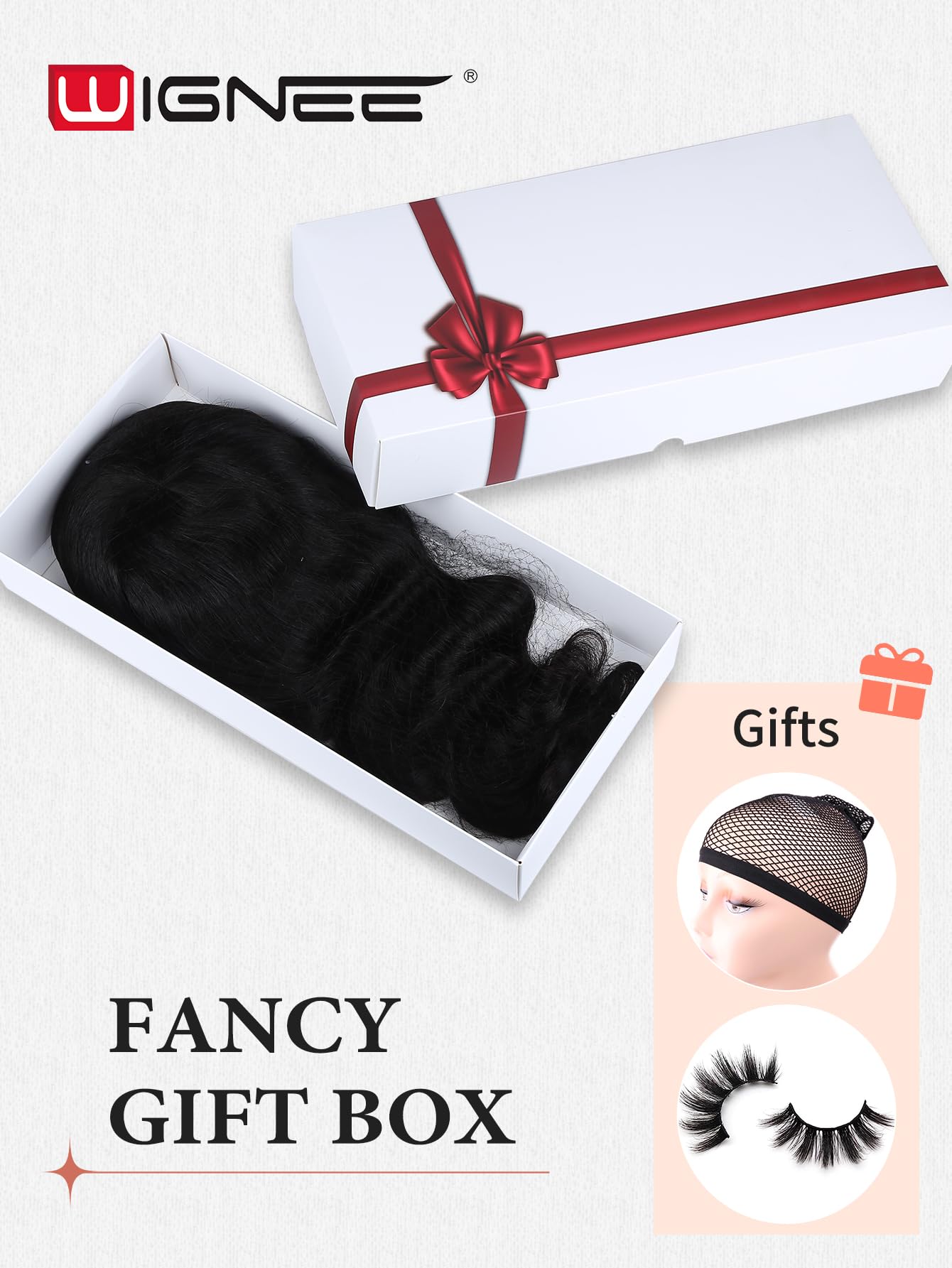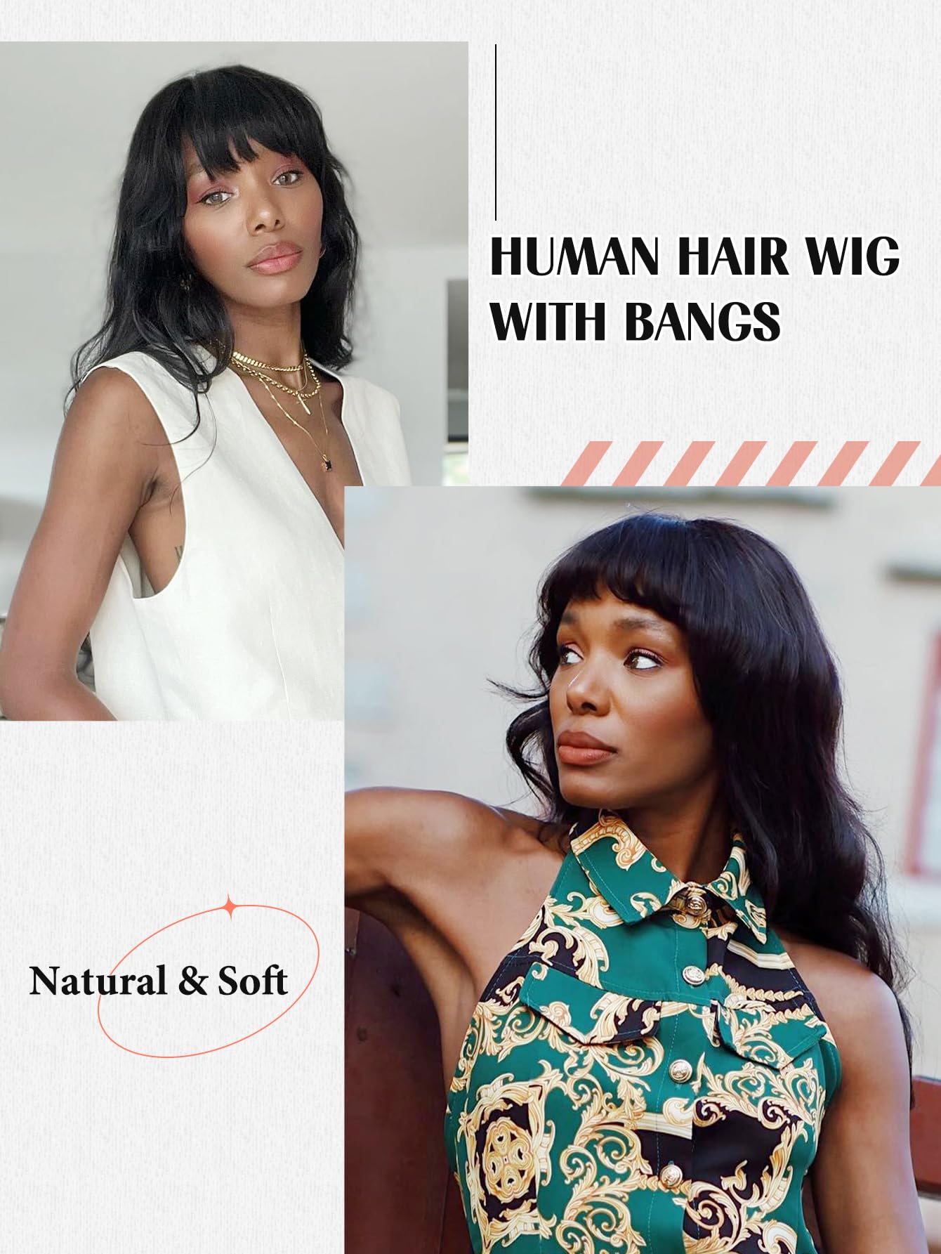 WIGNEE Natural Wave Wigs with Bangs 100% Brazilian Human Hair Wave Wigs Natural Black (18 Inch 1B)