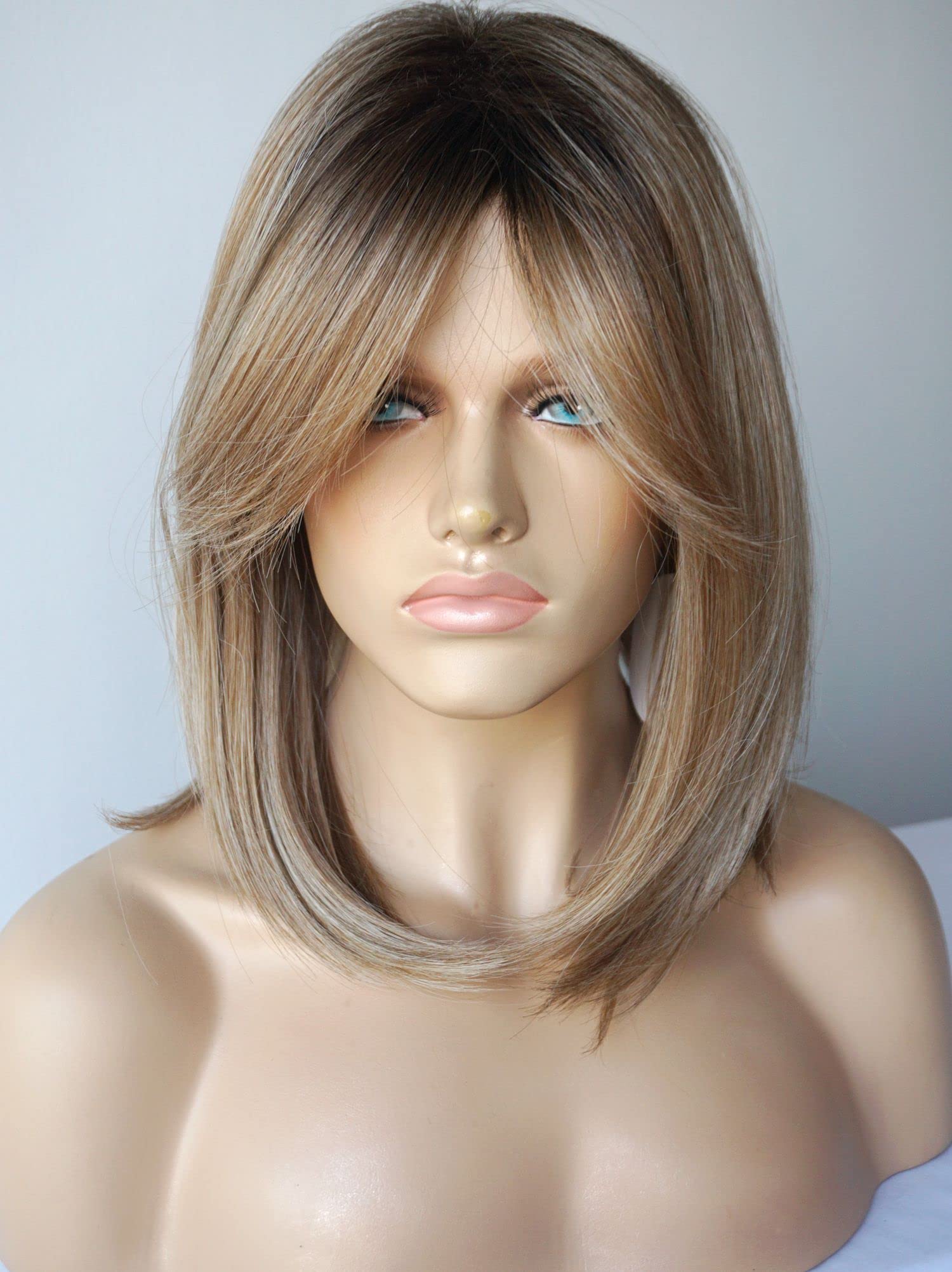 - Feature: medium length wigs for women blonde bob wig for white women wig with bangs Wigs blonde with white mixed highlights . This is fashion highlight hair ,pretty color and layered wigs with side bangs.